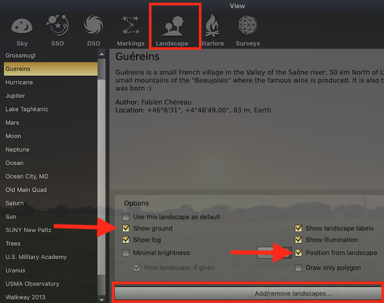 Troubleshooting: These instructions are for automatic installation of landscapes using the newest release of Stellarium. If it doesn't work, you may have an older version of Stellarium. If that is the case, you can simply update by downloading and installing the latest version of Stellarium, from Stellarium.org