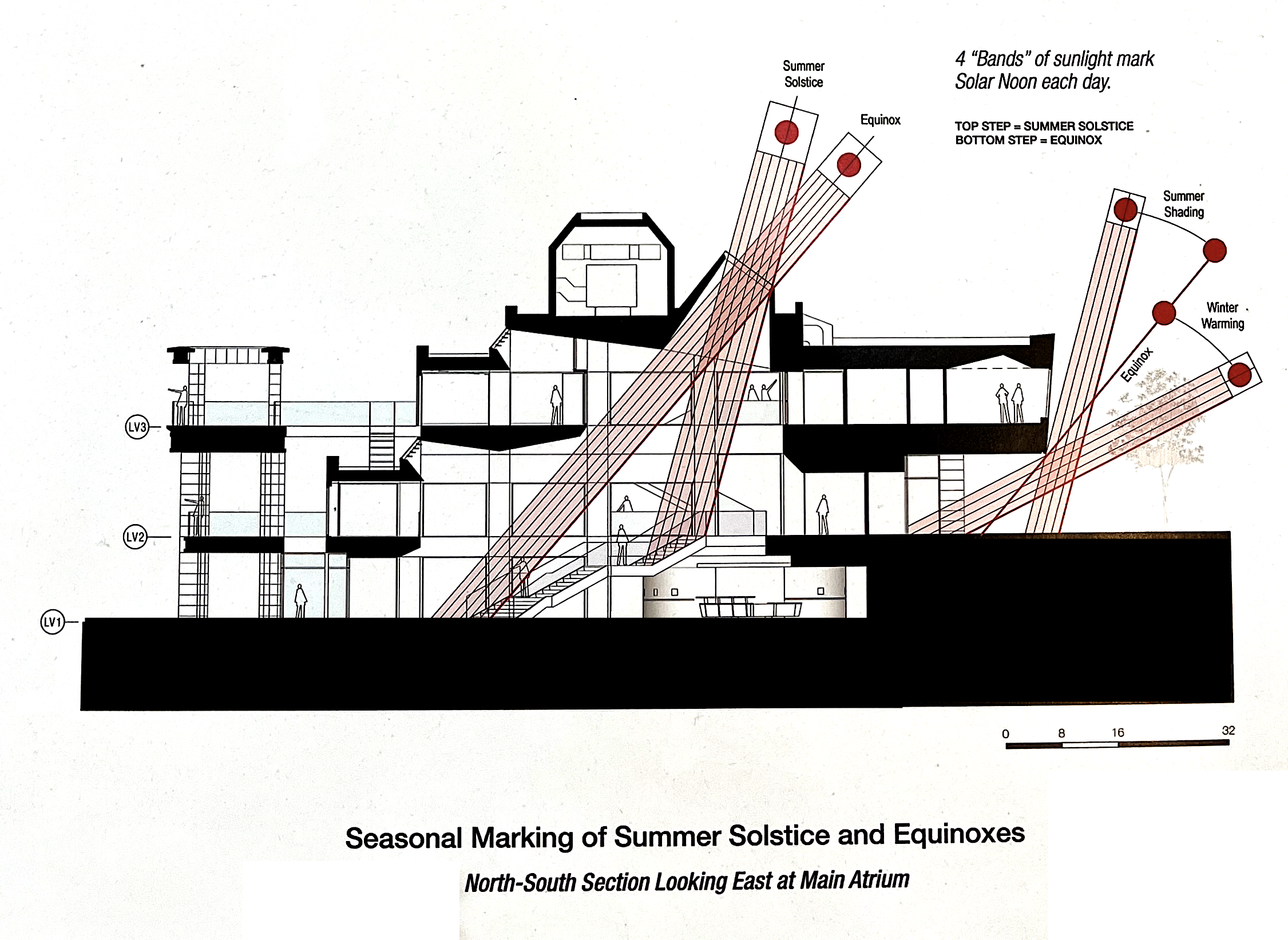 What happens at the Winter Solstice? The architects did not make any plans for it, but obviously something has to happen. But what? The campus is very quite then, because the students have left for the winter break, but it has been observed, though there are some remaining mysteries.